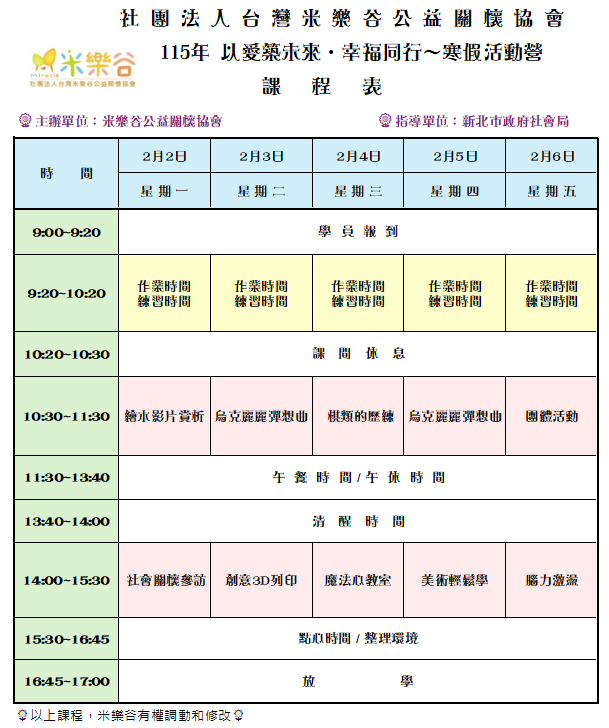 🎨所有課程費用、材料費用及餐費均由米樂谷愛心提供。
